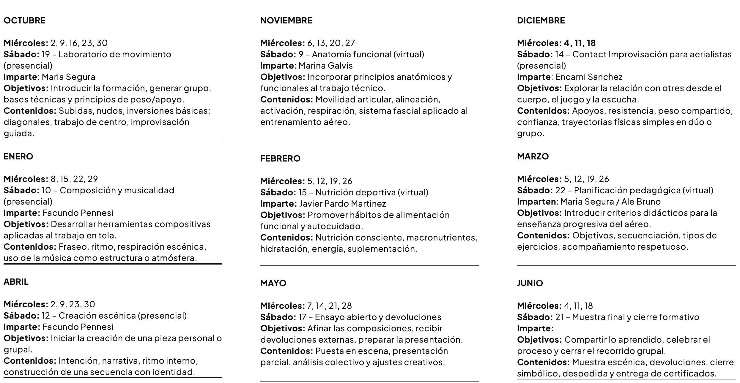 - Clases semanales: Miércoles de 11:00 a 14:00 h (1h30 danza + 1h30 laboratorio de tela)
